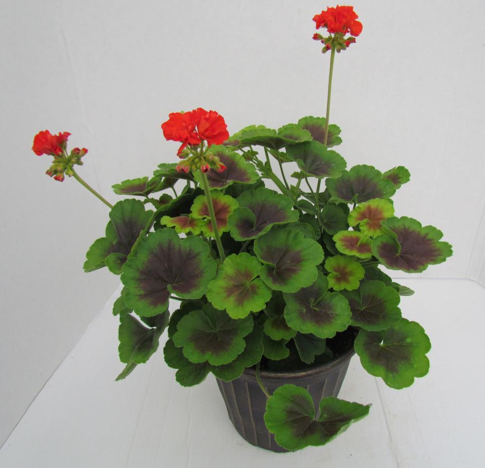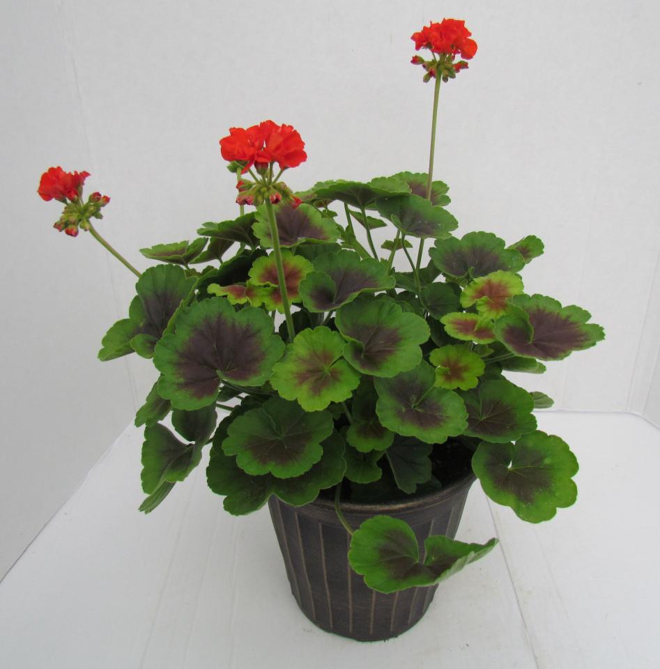 This robust plant keeps its distinguishing foliage color and brilliant blooms throughout the hot summers then becomes a fantastic transitional flower going into fall. The orange flowers contrast with the striking foliage making this geranium a much appreciated and talked about new annual winner.